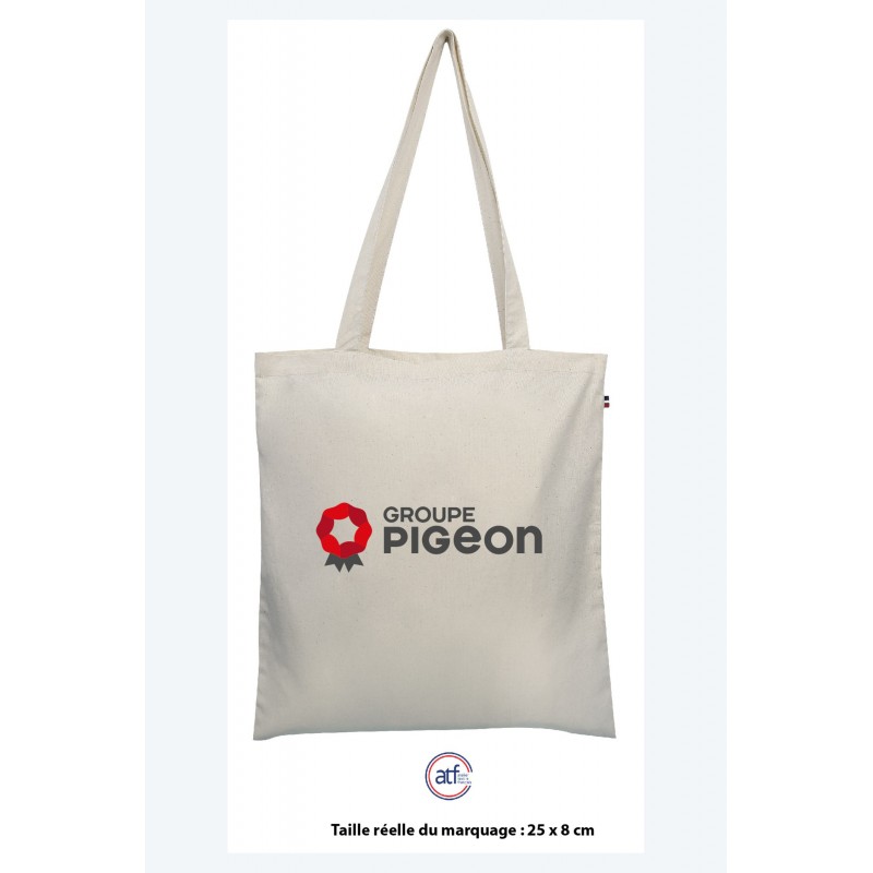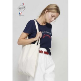 Sac shopping fabriqué dans les Vosges. - Sac en toile 150. - 100% coton issu de l'agriculture biologique. - 2 anses, porté main ou épaule. - Détail tricolore sur le côté. - 39x42 cm - couleur naturel